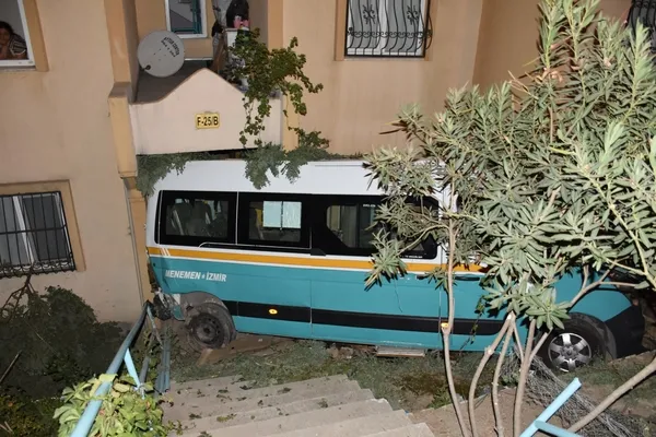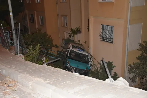 Sürücünün tüm çabalarına rağmen minibüs, geri geri giderek 4 katlı apartmanın bahçesine düştü. Minibüs zemin kattaki eve çarparak dururken, evde hasar oluştu.