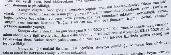 Antalya'da boşandığı eşinin boğazını keserek cani bir şekilde öldüren Anıl Karaman ağırlaştırılmış ömür boyu hapis cezasına çarptırıldı. Sanık Anıl Karaman'ın, cinayet öncesinde arama motoru Google'da 'Öldürmek hakkında ayet', 'Demi mesfuh', 'istiğfar', 'İbtihal: Halktan alâkayı keserek Allah'a niyazda bulunmak' kelimelerini arattığı ortaya çıktı.