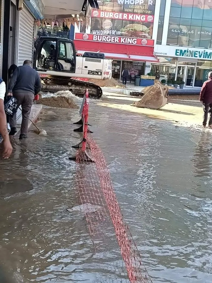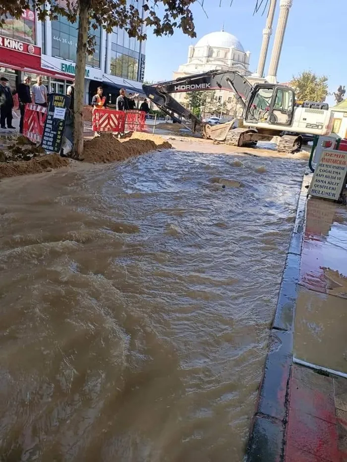 Çerkezköy Belediyesi meydanındaki Edip Sokak'ta Tekirdağ Büyükşehir Belediyesi Su ve Kanalizasyon Genel Müdürlüğü (TESKİ) ekipleri çalışma yaptığı esnada kepçe ana isale borusunu patlattı.