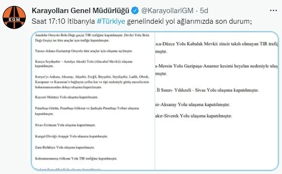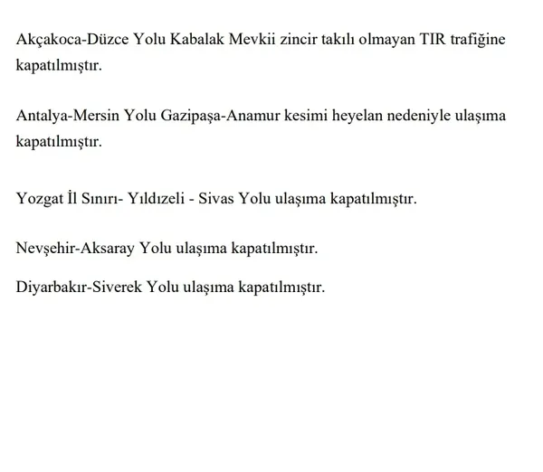 • Anadolu Otoyolu Bolu Dağı geçişi TIR trafiğine, Devlet Yolu Bolu Dağı Geçişi ise tüm araçlar için trafiğe kapatılmıştır.