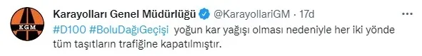 Twitter'dan açıklama yapan Karayolları Genel Müdürlüğü, "D100 Bolu Dağı Geçişi'nin yoğun kar yağışı olması nedeniyle her iki yönde tüm taşıtların trafiğine kapatılmıştır" dedi.