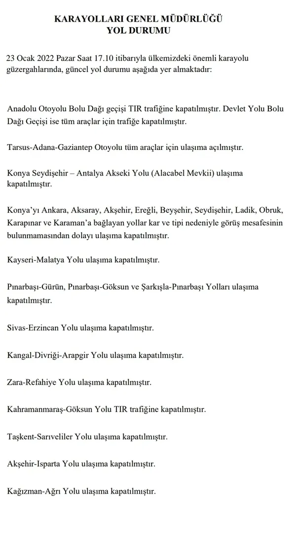 Karayolları Genel Müdürlüğü'nden yapılan açıklamada, 23 Ocak 2022 Pazar Saat 17.10 itibarıyla kar ve tipi dolayısıyla kapanan yolların güncel hali şu şekilde açıklandı: