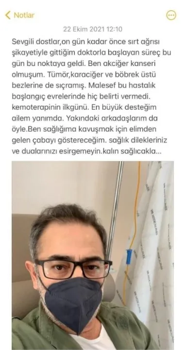 Edinilen bilgiye göre, birçok sinema filmi, tiyatro ve dizide rol alan Mersinli sanatçı Ayberk Pekcan, Mersin'de özel bir hastanenin onkoloji servisinde bir süredir akciğer kanseri tedavisi görüyordu.