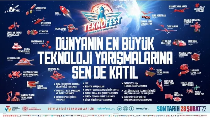 TEKNOFEST açıklamasına göre, dünyanın en büyük Havacılık, Uzay ve Teknoloji Festivali TEKNOFEST, 5. yılında TEKNOFEST 2022’ye hazırlanıyor. Rotasını Karadeniz'e çeviren TEKNOFEST, her yıl yüzbinlerce gencin başvuruda bulunduğu Türkiye'nin en büyük para ödüllü Teknoloji Yarışmaları'nı bu yıl 39'u ana yarışma olmak üzere 97 farklı kategoride düzenliyor. Milli Teknoloji Hamlesi ateşiyle yanan meşaleyi teknoloji ve bilimle buluşturacak gençler için yarışma başvuruları açılırken, görkemli festivalde yer almak ve Teknoloji Yarışmaları'nda kıyasıya mücadele etmek isteyenler 28 Şubat'a kadar 'www.teknofest.org' adresi üzerinden çevrim içi olarak başvurularını gerçekleştirebiliyor.