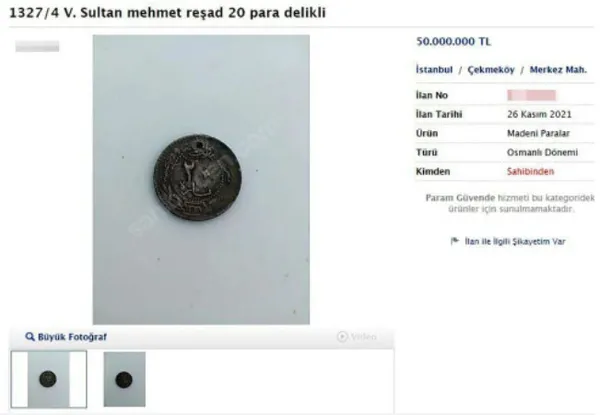Tarihi eser ya da antika niteliği taşıdığı düşünülen madeni paraların satışı için elektronik ticaret işlemlerinin yapıldığı platformda oluşturulan ilanlarda 'koleksiyonculara yönelik', 'tarihi para' gibi ifadelerin yanı sıra hangi döneme ait olduğu gibi bilgileri paylaşılıyor.