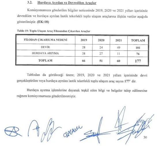 İBB Hukuk Komisyonu Başkanı Muhammet Kaynar; 2019, 2020 ve 2021 yılları içerisinde hurdaya ayrılan otobüs sayısının 177 olduğuna dikkat çekerek, "Hurdaya ayırma işlemlerine dayanak teşkil eden bilgi ve belgeler talep edilmesine rağmen komisyonumuza gönderilmemiştir. Raporun sunulmasından sonra gönderilen belgeler de eksik ve araçların akıbeti hakkında bilgi vermekten uzaktır. Özellikle, yanan ve kaza sonucu kullanımdan kaldırılan araçların akıbeti ve bu araçların sonrasında ne olduğu, kullanılabilir parçalarının ne olduğu belirsizdir" dedi.