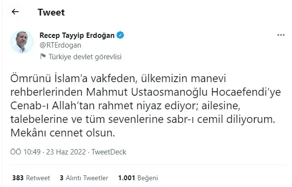 Mahmut Ustaosmanoğlu'nun cenazesi, 24 Haziran Cuma günü öğle namazına müteakip Fatih Camisi'nde düzenlenecek cenaze töreninin ardından toprağa verilecek.