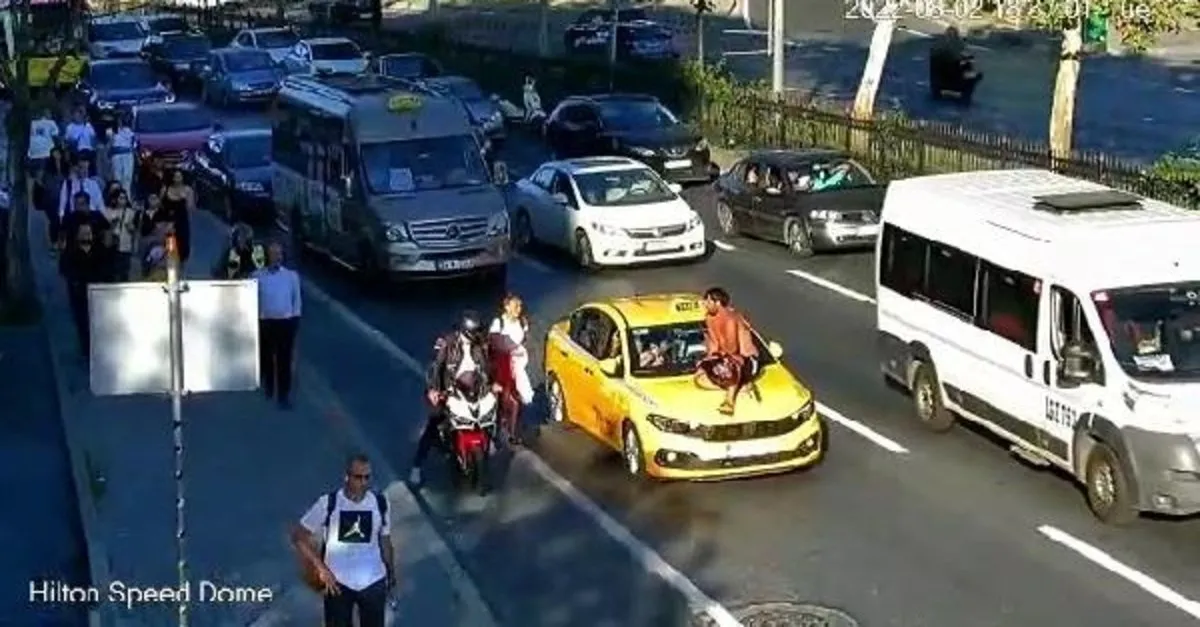 İstanbul’da kavga ettiği taksicinin hareket etmesi üzerine kaputa oturan adam yaklaşık 400 metre aracın üstünde ilerledi. İlginç anlar güvenlik kamerasına saniye saniye yansıdı.
