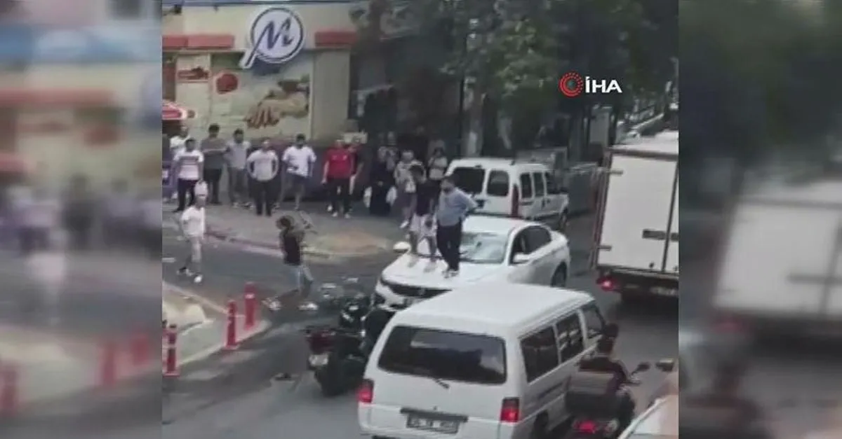 Yerde buldukları taşlarla ve metal eşyalarla otomobile saldıran şüpheliler defalarca otomobile vurdular. Bir türlü sakinleşmeyen şüphelilerden 2'si otomobilin üzerine çıkarak zıplamaya başladı. O anlar vatandaşların cep telefonu kamerasına yansıdı.