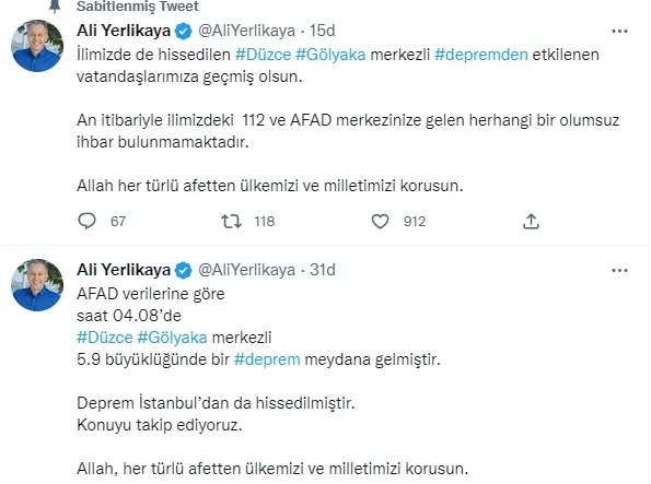 "Bugün Türkiye'de 28 bin toplanma alanı var, bu 3 yıl önce 8-9 bindi. Neden bugün var? Çünkü bunun ne olduğunu tatbikatlarda, çalışmalarda, planlamalarda görüyoruz. Bu işin sorumlusuyuz. Yurt, mahalle, şehirlerin neresinde olacak; tüm bunları eğer iyi planlarsak hepimiz adımları ona göre atarız. Buna kendimizi alıştırmak durumundayız. Her atılan adımın muhakkak faidesi söz konusudur. Tekrar geçmiş olsun. Bu akşam inşallah vatandaşlarımızla sabaha kadar güzel şekilde vakit geçirir, sabah çorbaları birlikte içeriz ve böyle bir depremle, afetle bir daha karşılaşmamış oluruz. Çocuklarımızın bu travmalarını atlatmaya hep beraber katkı sağlamış oluruz. Belediye Başkanımıza da çok teşekkür ediyorum, Allah razı olsun."