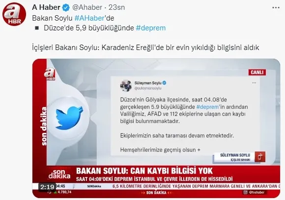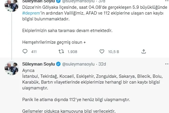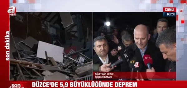 İçişleri Bakanı Süleyman Soylu, Düzce'deki depremin ardından kamu binalarıyla ilgili tespitlerin yapıldığını belirterek, "Kamu binalarında şu anda kayda değer hasar yok. Ufak tefek birtakım çatlakları arkadaşlar ilk andan itibaren tespit etmeye başladı." dedi.