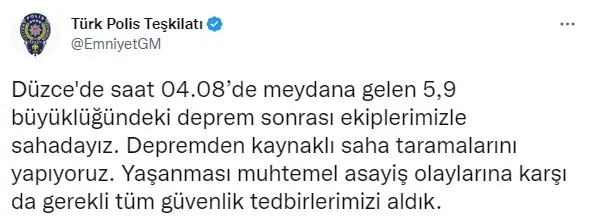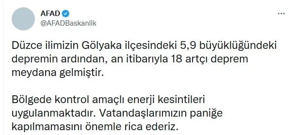 Afet ve Acil Durum Yönetimi Başkanlığı (AFAD), Düzce'nin Gölyaka ilçesinde 5.9 büyüklüğünde deprem meydana geldiğini açıkladı.