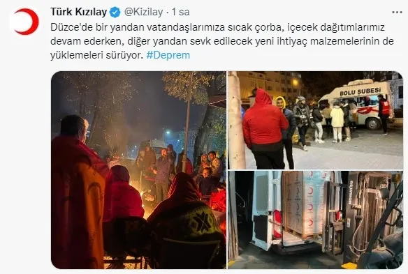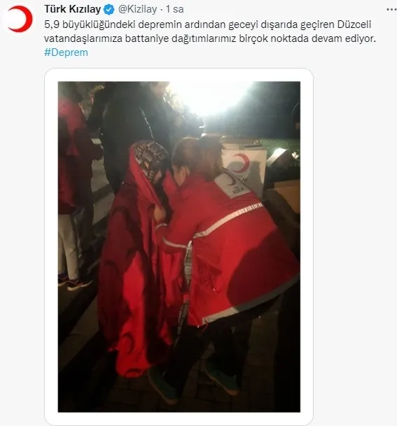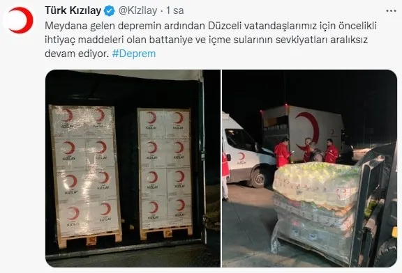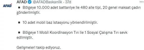 Bölgeye 10 bin adet battaniye ile 480 aile tipi, 20 genel maksat çadırı gönderilmiştir. 10 adet mobil baz istasyonu yönlendirilmiştir. Bölgeye 1 mobil koordinasyon tırı ile 1 sosyal çalışma tırı sevk edilmiştir."