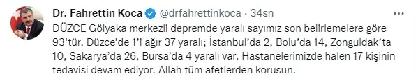 Sağlık Bakanı Fahrettin Koca, "DÜZCE Gölyaka merkezli depremde yaralı sayımız son belirlemelere göre 93'tür. Düzce'de 1'i ağır 37 yaralı; İstanbul'da 2, Bolu'da 14, Zonguldak'ta 10, Sakarya'da 26, Bursa'da 4 yaralı var. Hastanelerimizde halen 17 kişinin tedavisi devam ediyor. Allah tüm afetlerden korusun." dedi.