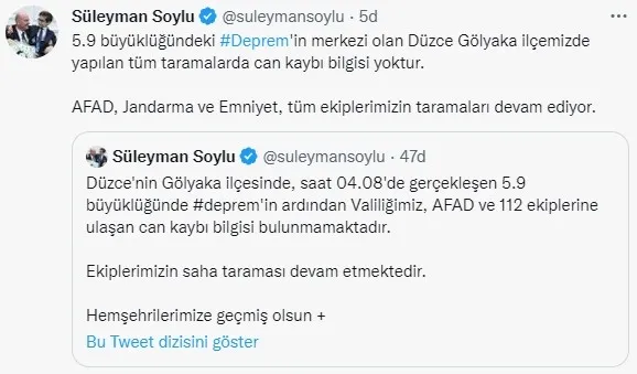 Beraberindeki Gençlik ve Spor Bakanı Mehmet Muharrem Kasapoğlu ile depremin merkez üssü Gölyaka ilçesinde esnafı ve AFAD tarafından kurulan çadırları ziyaret eden Soylu, vatandaşlara "geçmiş olsun" dileğinde bulundu.