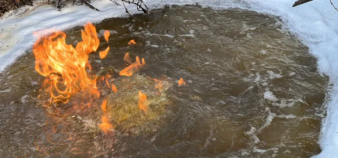 İlginç görüntüyü fark eden vatandaşlar, çakmak çakınca suyun yandığını tespit etti. Suyun neden yandığı ise henüz bilinmiyor.