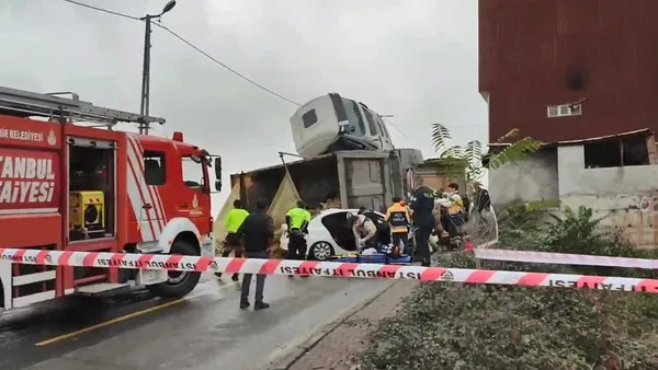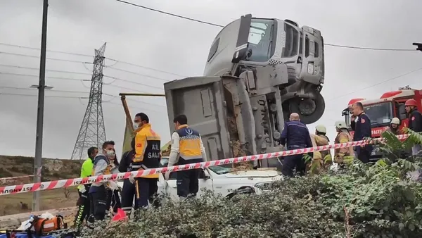 İstanbul Başakşehir'de seyir halindeki hafriyat kamyonu otomobilin üzerine devrildi.