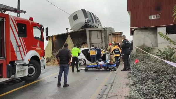 Ahmet Yesevi Caddesi'nde ilerleyen hafriyat kamyonu, kontrolden çıkarak caddede seyreden 06 CSN 182 plakalı otomobilin üzerine devrildi.