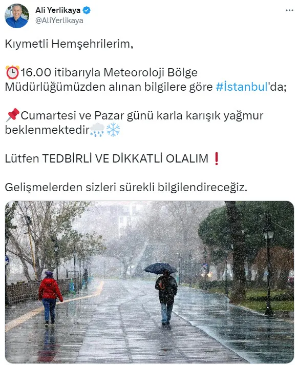İstanbul Valisi Ali Yerlikaya, sosyal medya hesabından yaptığı açıklamada, "Kıymetli Hemşehrilerim, 16.00 itibarıyla Meteoroloji Bölge Müdürlüğümüzden alınan bilgilere göre İstanbul'da; Cumartesi ve Pazar günü karla karışık yağmur beklenmektedir Lütfen TEDBİRLİ VE DİKKATLİ OLALIM Gelişmelerden sizleri sürekli bilgilendireceğiz." ifadelerine yer verdi.