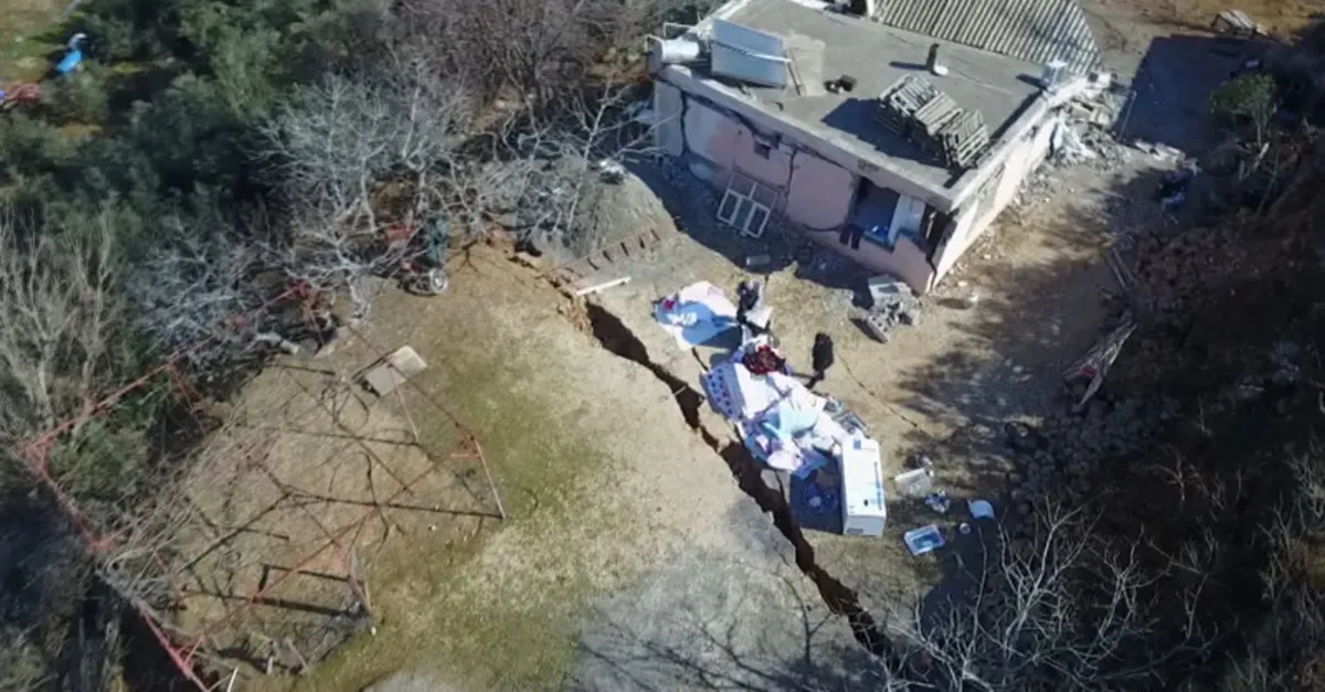 Kahramanmaraş depremlerinin köylere verdiği hasar, havadan görüntülerle ortaya çıktı. Gaziantep Nurdağı'nda Gökçedere köyünde evlerin ve yolların yanısıra mezarlıkta da yarıklar oluştuğu görüldü.