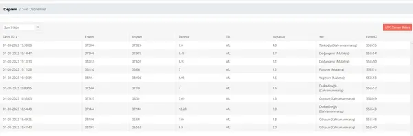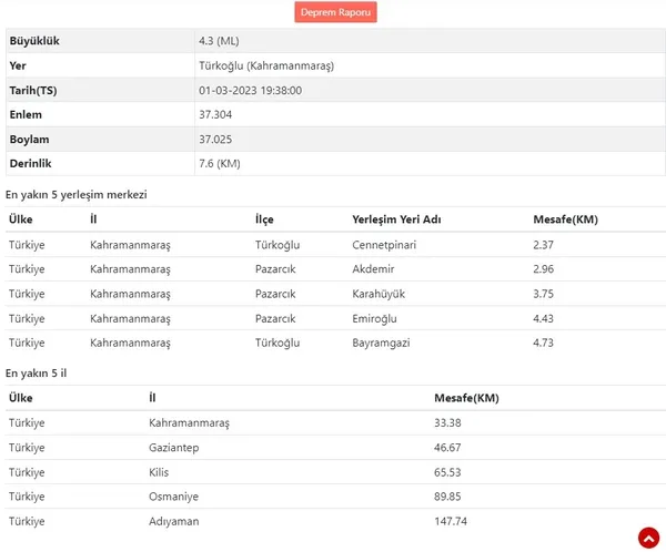 Büyüklük: 4.3 (Ml) Yer: Türkoğlu (Kahramanmaraş) Tarih: 2023-03-01 Saat: 19:38:00 TSİ Enlem: 37.304 N Boylam: 37.025 E Derinlik: 7.6 km