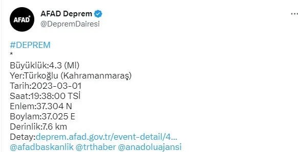 Son dakika... AFAD saat 19:38’de Kahramanmaraş Türkoğlu merkezli 4.3 büyüklüğünde depremin meyanda geldiğini açıkladı.