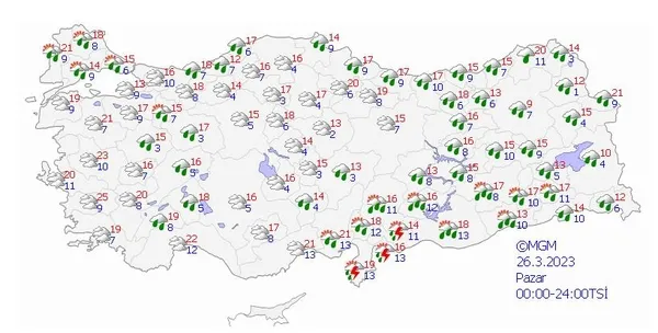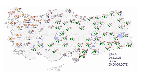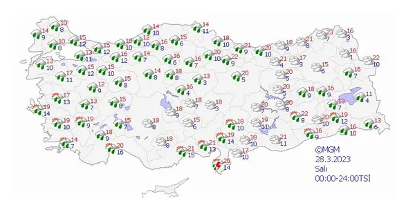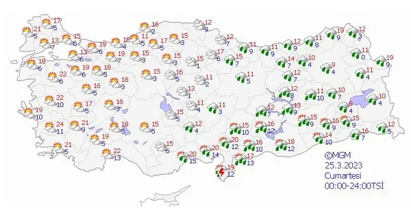 Meteoroloji Genel Müdürlüğü tarafından yapılan son değerlendirmelere göre; ülkemiz genelinin parçalı ve çok bulutlu, Akdeniz'in iç ve doğu kesimleri, İç Anadolu'nun doğusu, Orta ve Doğu Karadeniz ile Doğu ve Güneydoğu Anadolu'nun yağışlı geçeceği tahmin ediliyor. Genellikle yağmur ve sağanak, İç Anadolu'nun kuzeydoğusu, Doğu Karadeniz'in iç kesimleri ve Doğu Anadolu'nun yükseklerinde karla karışık yağmur ve yer yer kar şeklinde görülecek olan yağışların; öğle saatlerinde Diyarbakır, akşam ve gece saatlerinde Gaziantep, Kilis, Adıyaman ve Şanlıurfa çevrelerinde yerel kuvvetli olması bekleniyor. Doğu Karadeniz'in iç kesimleri ile Doğu Anadolu'nun eğimli ve yüksek kesimlerinde çığ tehlikesi riski bulunmaktadır.