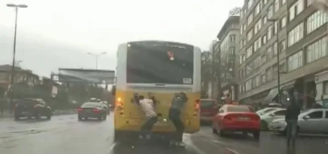 Unkapanı'nda patenli iki genç hızla ilerleyen İETT otobüsünün arkasına tutundu.
