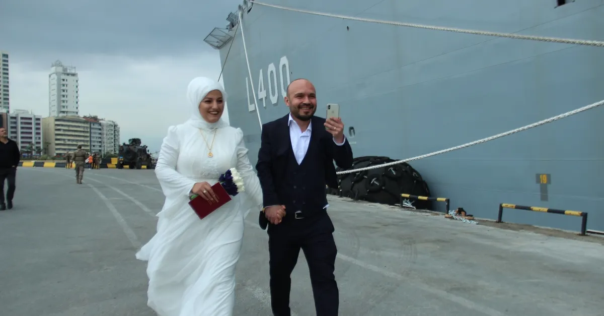 İzmir'de yaşayan Kamil Tekmen ve Ebru Karaca Tekmen çifti, gerçekleşen nikah merasimlerinin hemen ardından soluğu TCG Anadolu gemisinin demirlediği İzmir Alsancak Limanı'nda aldı. Gemiyi merak ettiklerinden dolayı nikahın hemen ardından gelinlik ve damatlıklarıyla rıhtıma gelen çiçeği burnunda çift, renkli görüntülere sahne oldu.