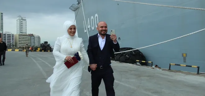 Yerli ve milli üretim TCG Anadolu gemisi İzmir Alsancak Limanı'nda çarşamba günü vatandaşın ziyaretine açıldı. İzmirliler TCG Anadolu'ya ziyarete açıldığı ilk günden itibaren büyük ilgi gösterdi. İzmir'de yaşayan çiçeği burnunda bir çift, nikah merasiminin hemen ardından TCG Anadolu'yu görmek için İzmir Alsancak Limanı'na geldi. Geminin İzmir'de bulunması sebebiyle fotoğraf çekimini TCG Anadolu'da yapacaklarını belirten çift, gelinlik ve damatlıkla TCG Anadolu'yu ziyaret etti. İşte o görüntüler...