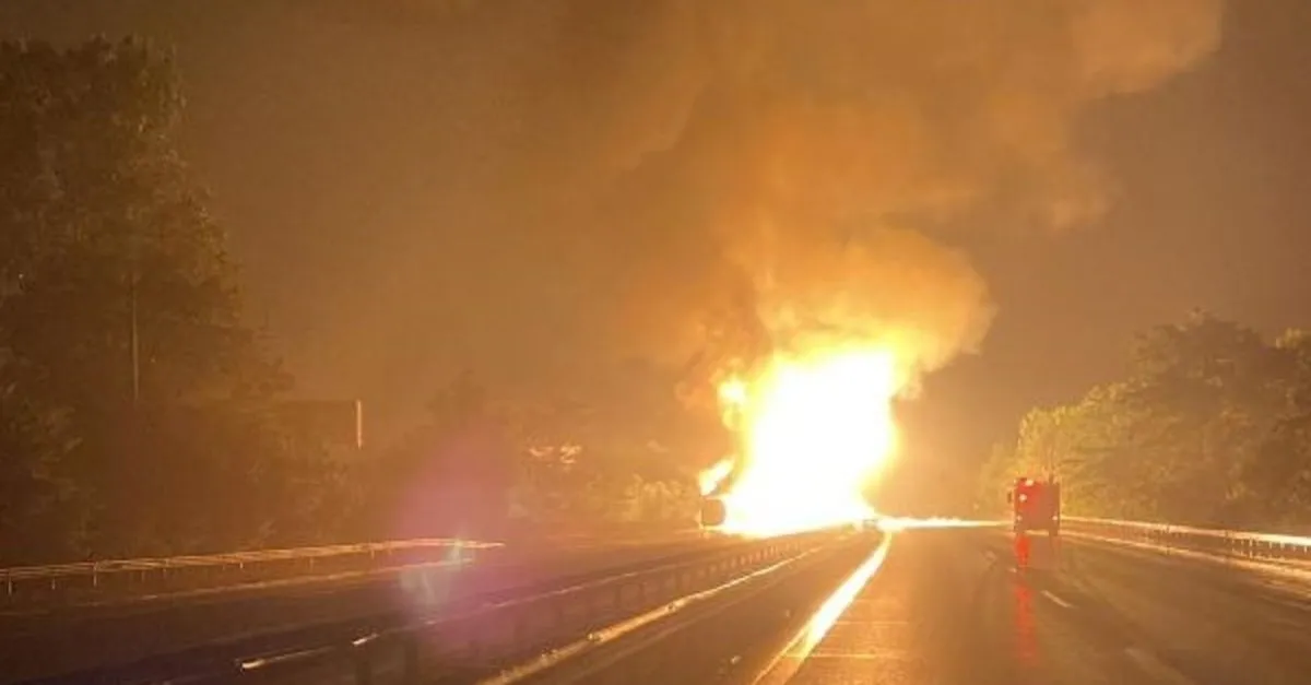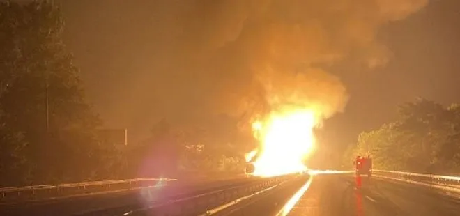 İstanbul yönünden Ankara yönüne giden Sinan Yetkin idaresindeki 14 ABZ 345 plakalı metal konteyner yüklü TIR, saat 03.30 sıralarında TEM Otoyolunun Arifiye geçişine geldiğinde lastiği patlayıp, alev aldı.