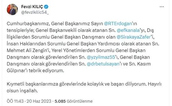 Kılıç'ı unutmayacaklarını belirten Yüce, "Hem siyasi hem gönül dostluğumuzu unutmayacağız. Sevgiyle, muhabbetle, dürüstlükle dolu dolu bir hayat yaşadı. Lekesiz kardeşimizdir. Hepimizin başı sağ olsun. Allah gani gani rahmet eylesin İnşallah." ifadelerini kullandı.