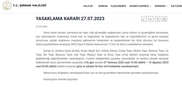 Valilik açıklamasında, "İlimiz mülki sınırları içerisinde yer alan; milli güvenliğin sağlanması, kamu düzeni ve güvenliğinin korunması, suç işlenmesinin önlenmesi, temel hak ve özgürlükler ile başkalarının hak ve özgürlüklerinin ve genel asayişin korunması, şiddet olaylarının meydana gelmesinin önlenmesi ve yaşanabilecek her türlü olumsuz bir durumun önüne geçilebilmesi amacıyla, 5442 Sayılı İl İdaresi Kanunu'nun 11'inci ve 66'ncı maddelerine istinaden; Uludere ilçesi Andaç Köyü Mujili Sırtı, Gilatte Deresi, Dolap Tepe, Meme Tepe, Berereş Tepe, Uç Tepe, Kel Tepe, Beyazsu Tepe, Çalı Tepe, Meşkul Tepe ve Dona Tepe kırsal alanları arasında kalan bölgelere gidebileceği değerlendirilen vatandaşların, mezkûr bölgelerdeki yasadışı unsurlardan ve bunlara yönelik alınacak tedbirlerden zarar görmemeleri açısından 15 gün süreyle 27 Temmuz 2023 saat 19.00 dahil, 10 Ağustos 2023 saat 00.00 dahil tarihleri arasında giriş ve çıkışlar ile tüm sivil faaliyetler yasaklanmıştır. Bahse konu bölgelere, vatandaşlarımızın can ve mal güvenlikleri bakımından girmeleri yasaklanmıştır" denildi.