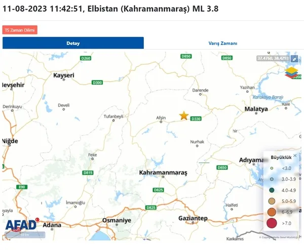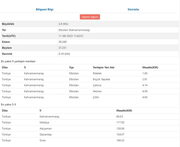 Büyüklük:3.8 (Ml) Yer:Elbistan (Kahramanmaraş) Tarih:2023-08-11 Saat:14:42:51 TSİ Enlem:38.269 N Boylam:37.251 E Derinlik:0.19 km
