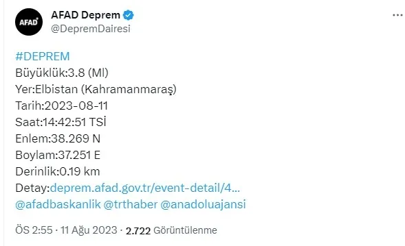 Son dakika: AFAD Kahramanmaraş'ın Elbistan ilçesine saat 14:42'de 3.8 büyüklünde bir deprem meydana geldiğini açıkladı.