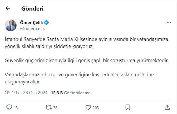 Sarıyer'deki silahlı saldırıda, hayatını kaybeden Tuncer Cihan isimli vatandaşımızın ailesine ve yakınlarına bir kez daha baş sağlığı dilediğini ifade eden Yerlikaya, "Bildiğiniz üzere bugün Sarıyer Santa Maria Kilisesi'nde pazar ayini sırasında maskeli 2 şahıs tarafından düzenlenen silahlı saldırıda, Tuncer Cihan isimli vatandaşımız maalesef hayatını kaybetmiştir. Olaydan hemen sonra yaptığımız açıklamada faillerin en kısa sürede yakalanıp adalete teslim edileceğini, yaşanan hadiseyi şiddetle kınadığımızı belirtmiştim. Menfur saldırı sonrası İstanbul Emniyetimiz çok hızlı ve kapsamlı bir çalışma başlattı. Gün boyu emniyet güçlerimiz 30 ayrı adrese baskın düzenledi ve şu ana kadar 47 şahıs gözaltına alındı.