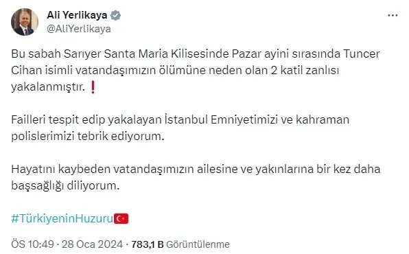 Bakan Yerlikaya, sosyal medya hesabından yaptığı açıklamada 2 katil zanlısının yakalandığını duyurdu. Yerlikaya, "Bu sabah Sarıyer Santa Maria Kilisesi'nde Pazar ayini sırasında Tuncer Cihan isimli vatandaşımızın ölümüne neden olan 2 katil zanlısı yakalanmıştır" ifadelerini kullandı.