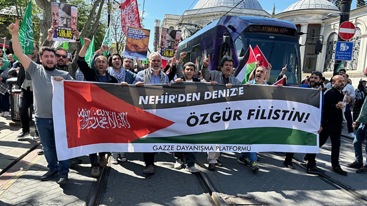Gruptakiler, daha sonra tekbir getirip "Her yer Gazze, her yer direniş", "Hamas'a selam, direnişe devam", "Katil İsrail Filistin'den defol", "Müslüman uyuma, kardeşine sahip çık", "Siyonist katiller hesap verecek", "Cenk, cihat, şehadet" sloganları attı.