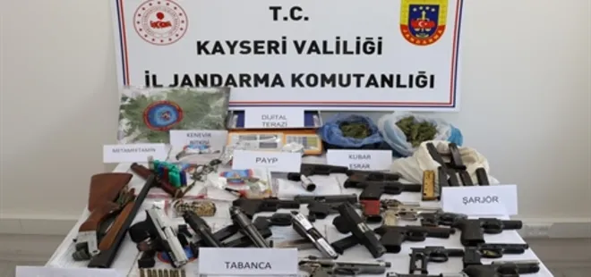 Adreslerde yapılan aramalarda, 2 gram metamfetamin, 210 gram esrar, 1 gram bonzai, 29 kök Hint keneviri, 20 gram kenevir tohumu, 10 uyuşturucu kullanma aparatı, 1 hassas terazi, 26 tabanca, 17 tabanca üst kapağı, 31 şarjör, 2 av tüfeği, 50 fişek, 2 bıçak, 1 Kalaşnikof kasaturası ve 1 muşta ele geçirildi.