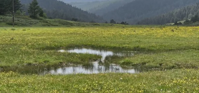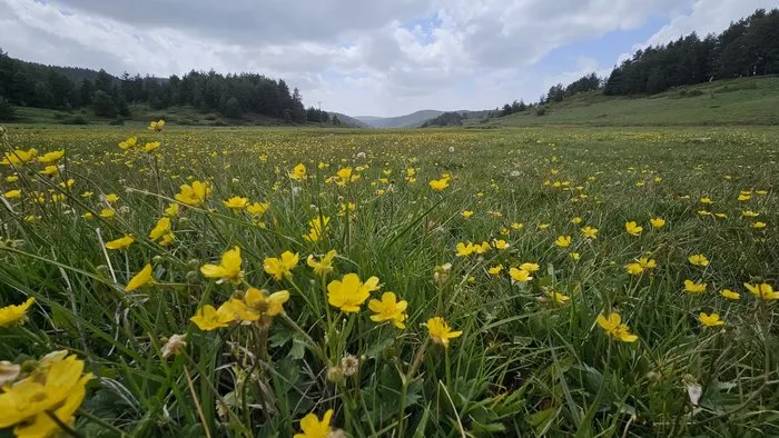 Yemyeşil yaylalarda açan sarı çiçekler, seyrine doyumsuz manzaralar oluşturdu.
