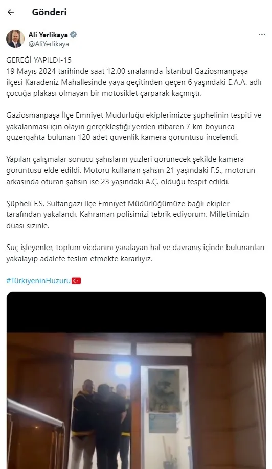 Olayla ilgili sosyal medya hesabından açıklamalarda bulunan İçişleri Bakanı Ali Yerlikaya, "19 Mayıs 2024 tarihinde saat 12.00 sıralarında İstanbul Gaziosmanpaşa ilçesi Karadeniz Mahallesinde yaya geçidinden geçen 6 yaşındaki E.A.A. adlı çocuğa plakası olmayan bir motosiklet çarparak kaçmıştı. Gaziosmanpaşa İlçe Emniyet Müdürlüğü ekiplerimizce şüphelinin tespiti ve yakalanması için olayın gerçekleştiği yerden itibaren 7 km boyunca güzergahta bulunan 120 adet güvenlik kamera görüntüsü incelendi. Yapılan çalışmalar sonucu şahısların yüzleri görünecek şekilde kamera görüntüsü elde edildi. Motoru kullanan şahsın 21 yaşındaki F.S., motorun arkasında oturan şahsın ise 23 yaşındaki A.Ç. olduğu tespit edildi. Şüpheli F.S. Sultangazi İlçe Emniyet Müdürlüğümüze bağlı ekipler tarafından yakalandı" ifadelerine yer verdi.