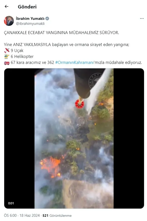 Çanakkale'nin Eceabat ilçesinde orman yangını çıktı. Rüzgarın etkisiyle büyüyen yangına karadan ve havadan müdahale ediliyor. Anafartalar Köyü boşaltıldı. Çanakkale Boğazı, kuzey-güney yönünde gemi trafiğine kapatıldı. Bakan Yumaklı yaptığı açıklamada '9 uçak 6 helikopter, 67 kara aracımız ve 362 Ormanın Kahramanı'mızla müdahale ediyoruz.' dedi. Öte yandan Çanakkale'deki orman yangını nedeniyle tarihi alana girişler durduruldu. Milli Savunma Bakanlığı ise yangın söndürme çalışmalarına destek için Kara Kuvvetleri Komutanlığına ait 2 helikopter, 1 itfaiye, 1 arazi aracı ve personel görevlendirildiğini duyurdu. Alevler sürerken Bakan Yumaklı 'Orman Kahramanlarımız alevlerle mücadelesini gece de sürdürüyor. Hedefimiz en kısa sürede yangını kontrol altına almak.' açıklamasını yaptı.