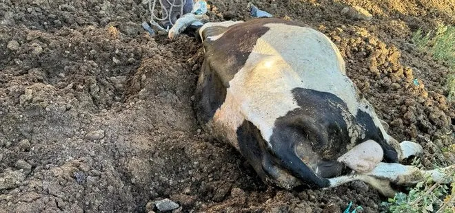Çiftlik sahibi Bozyel ve çalışanları ineği bulunduğu yerden çıkarmayı başaramadı.