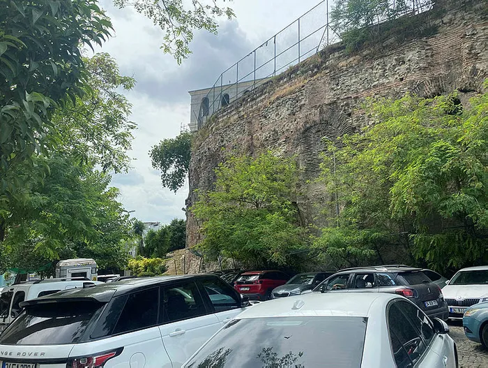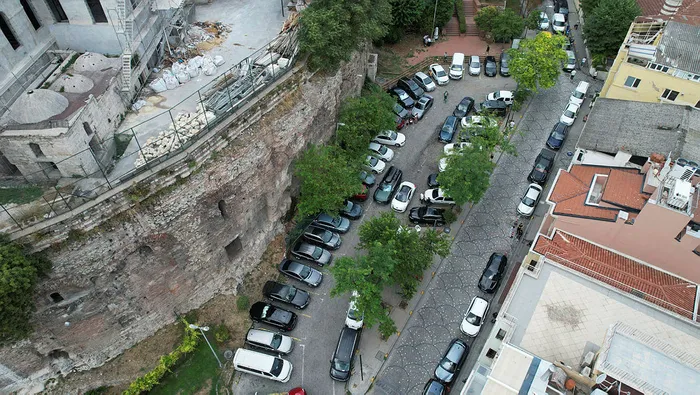 Tarihi hipdromun otopark olarak kullanılan duvarı havadan görüntülendi. Turistlerin de yoğun ilgi gösterdiği noktada bulunan otoparkta, araçların yapıya yakın bir şekilde park edildiği görüldü. Eserin görünümünün bir bölümünü kapatan araçlar yaya erişimine engel olurken, alanın çevresindeki pazar tezgahları da dikkat çekti.