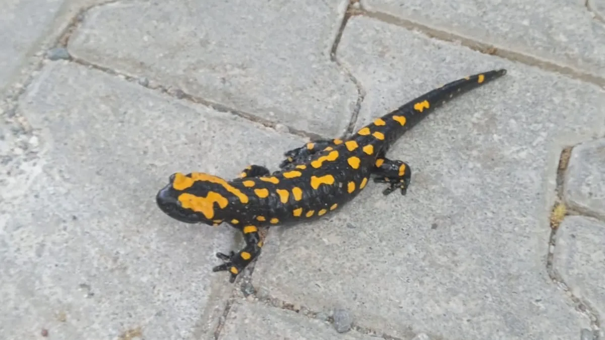 Adıyaman'ın Kahta ilçesine bağlı Güzelçay köyünde türüne az rastlanan ve nesli tükenmekte olduğu için koruma altına alınan sarı benekli semender görüldü.