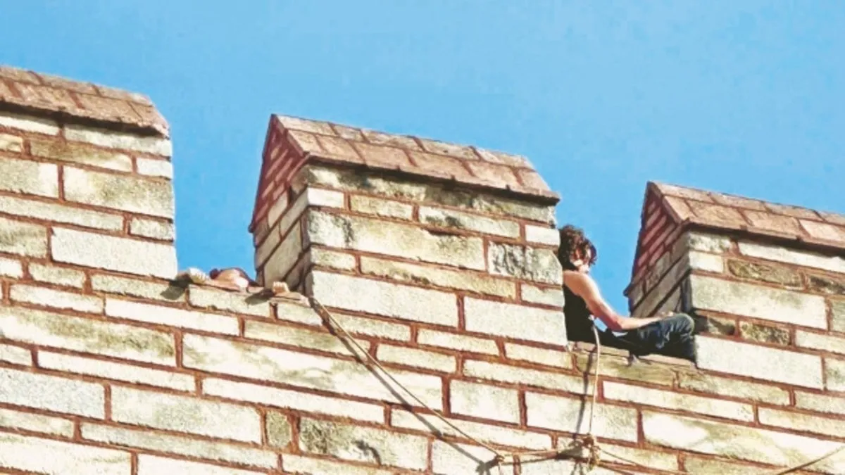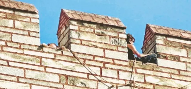 Görüntülerde surlara çıkan Semih Çelik'e bakarak konuşan Uzuner de surların üzerine çıkıyor.