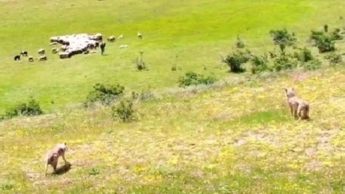 Erzincan’da iki kurt yaylada otlayan koyun sürüsüne saldırmak üzereyken çobanın drone kamerasına yakalandı. Bakın sonra neler yaşandı. İşte saniye saniye o görüntüler...