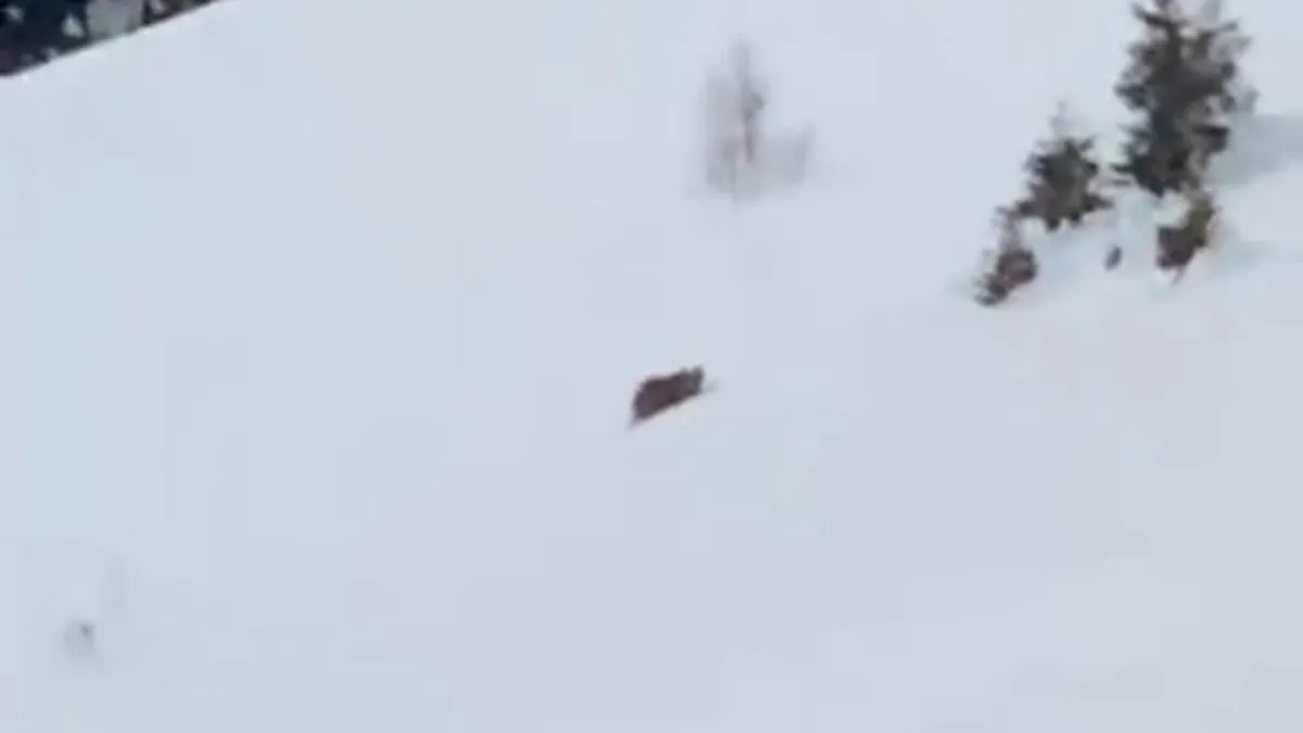 Rize'nin Çayeli ilçesine bağlı Vicvanak Yaylası'nda kış uykusuna yatmayan ayı, karların içerisinde yuvarlandığı sırada yayla sakini Burak Öztürk isimli vatandaş tarafından fark edildi.