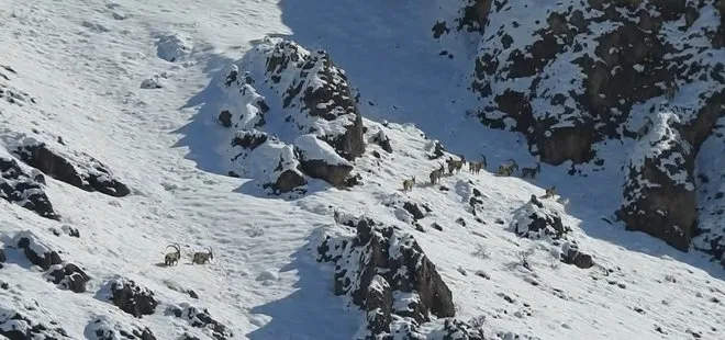 Mevsime bağlı zirvelerden alçak kesimlere inen keçiler kış aylarına yaklaşırken göç yoluna koyuluyor. Göç yolunda karlı zirvelere çıkan yaban keçileri görüntülendi.