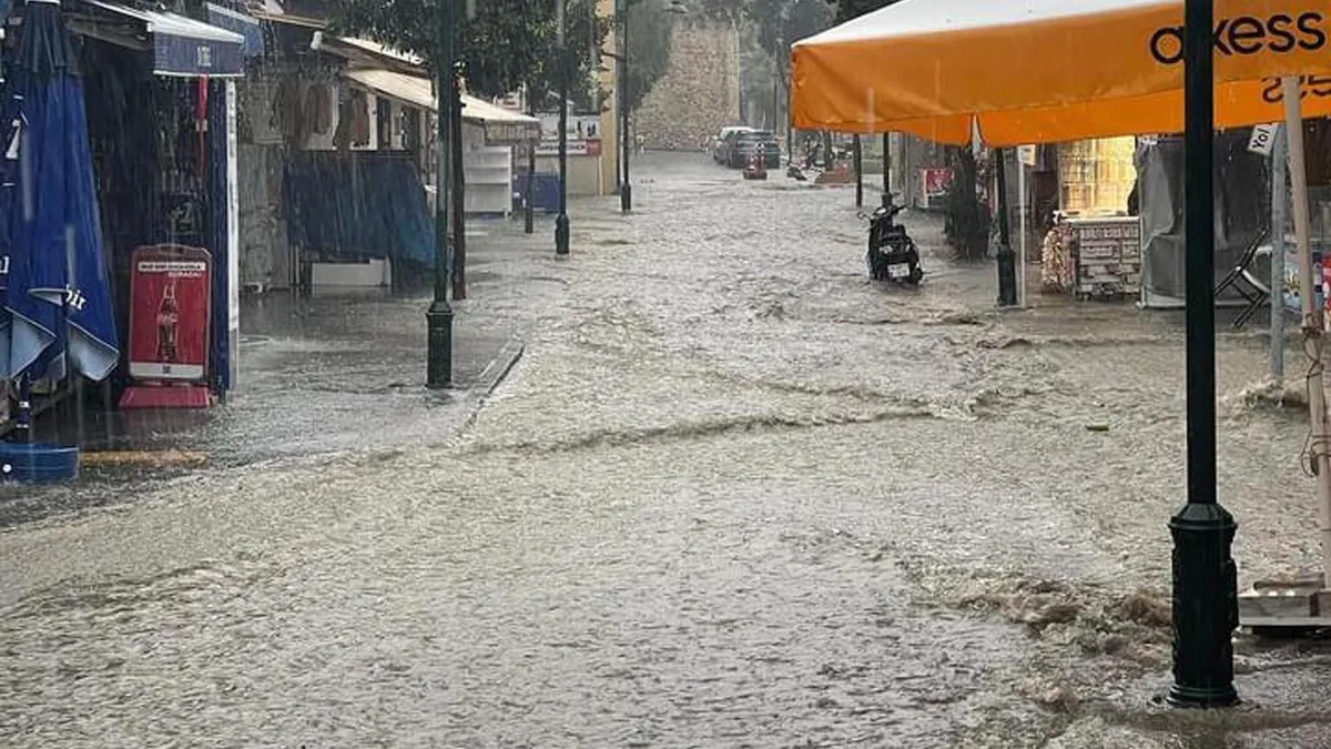 İzmir'in Çeşme ilçesinde etkili olan kuvvetli sağanak nedeniyle Alaçatı pazar yeri ile liman girişini su bastı.